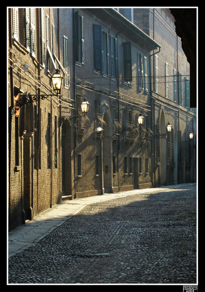 | Vicolo di Ferrara: sono rimasto colpito dal fatto che i lampioni sembrasso accessi quando invece erano semplicemente illuminati dal sole che stava tramontando. |