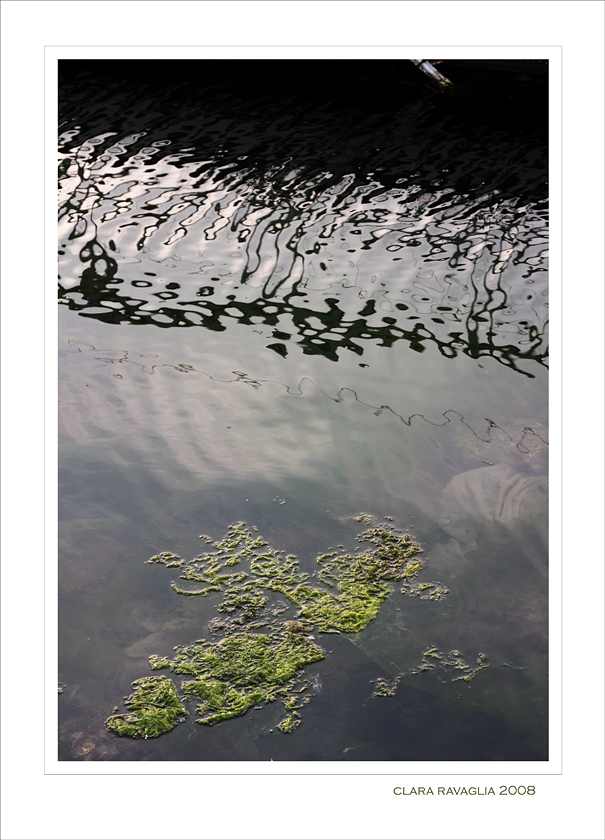 La parte superiore, quella scura, sarebbe da vedere stampata, ché col monitor si percepiscono dettagli più o meno chiari a seconda dell'angolazione (sopra c'è un argine, qualcosa, che fa ombra sull'acqua di sotto?). La luminosità di quelle "parti chiare", quasi impercettibile se non si guarda a lungo, rischia di diventare un po' fastidiosa per l'occhio: in quest'ottica la scelta di una cornice, che per la parte inferiore trovo abbastanza azzeccata, forse può contribuire in stampa ad accentuare questo lieve e allo stesso tempo forte contrasto (lieve perché quasi non si nota, forte perché lì ci si aspetta un nero assoluto che invece non c'è). Nero assoluto che personalmente preferirei, perché bilancerebbe con la sua intensità la vivacità del verde di quei "resti", e inquadrerebbe la parte superiore, non facendo mancare niente che potrebbe essere sopra e suggerendo una linea di luce, diagonale, da in alto a sinistra a in basso a destra, che rende il gioco di linee sull'acqua armonioso e piacevole, come se fosse un'introduzione alla palpabile consistenza di quei "remains", che trovo resi benissimo.