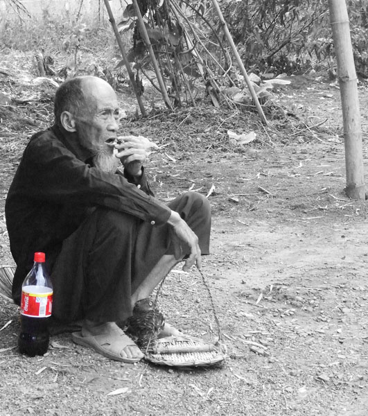 | E' proprio la bottiglia l'elemento che sembra riportare l'uomo alla "civiltà"; o meglio mi piaceva il forte contrasto tra lo spirito eremita dell'uomo orientale (+ civetta ai piedi) e la Coca-Cola, elemento invece simbolo della cultura occidentale, della globalizzazione e sicuramente lontano anni luce dall'essere associato all'eremitismo.