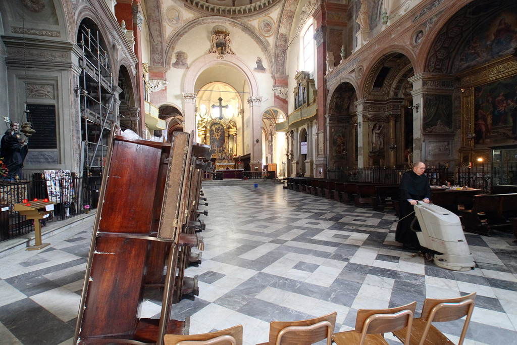 Io avrei provato una ripresa dall'altro lato della navata così da prendere in pieno "l'uomo delle pulizie" e inolre far vedere meglio tutta la fila delle panche alzate... così mi sembra come se mancasse qualcosa perchè il momento era davvero buono (anche le sedie tagliate in basso non aiutano...).