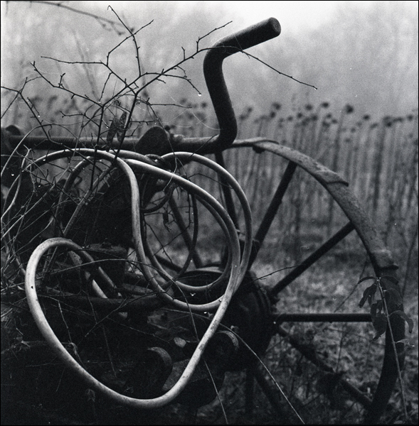 Mi piace il dialogo tra le curve di tubi/ruota e lo spezzato dei rami. Anche, tra i grigi, la punteggiatura chiara delle gocce d'acqua. Inquadratura stretta, senz'aria (considerazione non critica): l'unica via di fuga è bloccata dalla schiera di "girasoli scarni": bella!