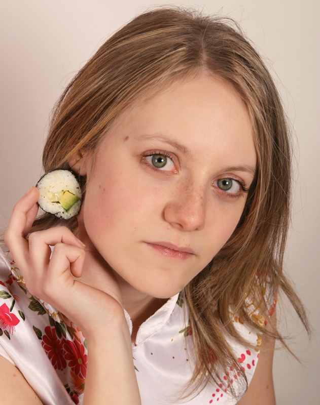 La immagine virata colori acidi a me piace come resa, ma è la posa che non convince, lo sguardo che nega il cibo, le labbra serrate ed indifferenti, ma senza che a questo si accompagni alcun segno di ironia.