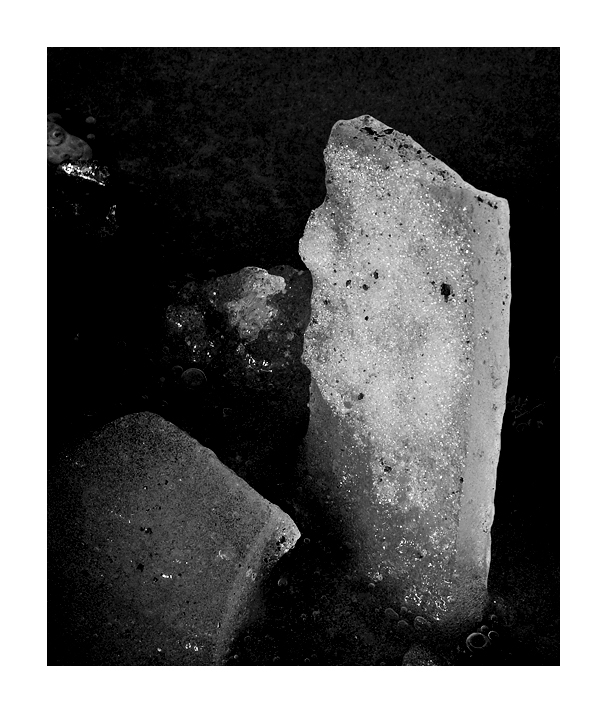 Il soggetto non è altro che un pezzo di ghiaccio di una pozzanghera,che vedendolo così in piedi mi ha fatto tornare alla mente le pietre di Stonage,e mi è piaciuta l'idea di riprenderlo ravvicinato e poi convertire il tutto in b/n,lasciando visibili solo alcuni pezzi di ghiaccio oltre a quello principale.