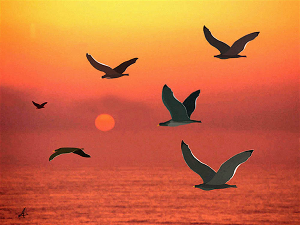 l'idea è buona ma l'esecuzione ha qualche pecca, la foto di base non è molto nitida ed il rumore è parecchio. Lo stormo i volo da un po' troppo l'impressione di incollato, non è ben fuso con il paesaggio.