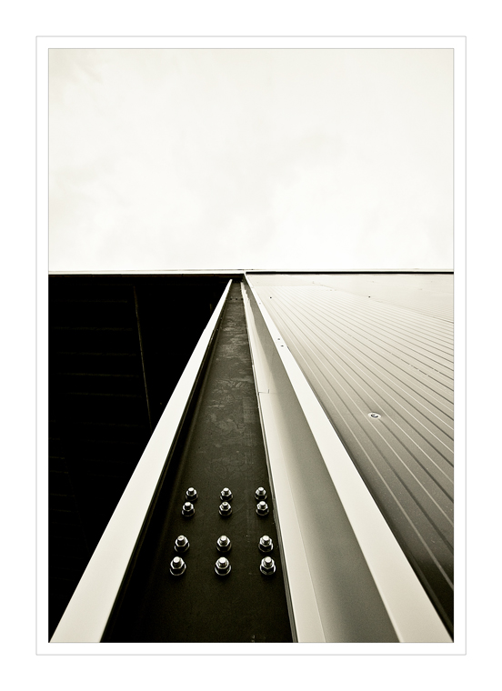 A mio avviso è stupenda...la simmetria perfetta, contraddetta dalle campiture diverse delle varie parti è molto suggestiva. Ottimo il cielo, se di cielo si tratta, che appena colorato si integra perfettamente con la struttura sottostante. Elemento interessante anche i bulloni, asimmetrici e a cavallo dell'asse centrale di simmetria movimentano lo scatto.