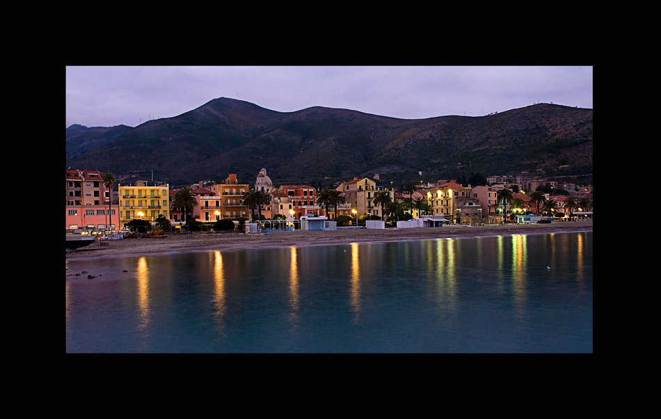 un bel panorama notturno con colori e luci gestiti molto bene, la sensazione di pendenza è dovuta ad un effetto ottico, infatti se si osserva gli edifici, sono perfettamente verticali e raddrizzando la spiaggia si renderebbe obliqui quest'ultimi.