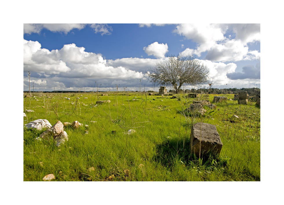 Bello scatto, per colori compo e gestione della luce. Stupendo il cielo azzurro con le nubi abbinato ad un prato con dei resti archeologici (sembra), il tocco finale l'albero spoglio giustamente decentrato. Complimenti