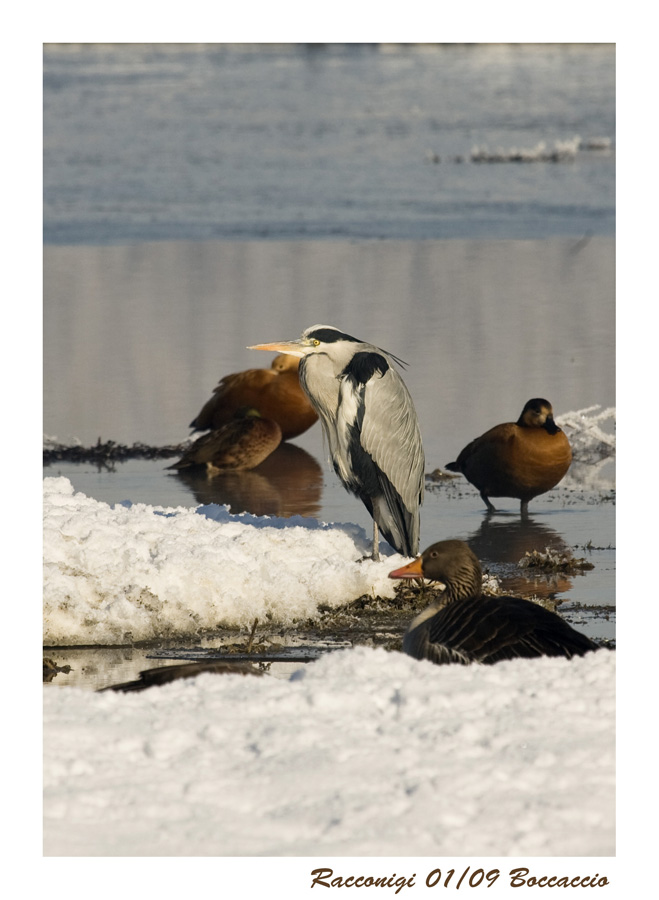 Piacevole insieme di volatili dove l'airone fa da protagonista, maestoso e infreddolito.