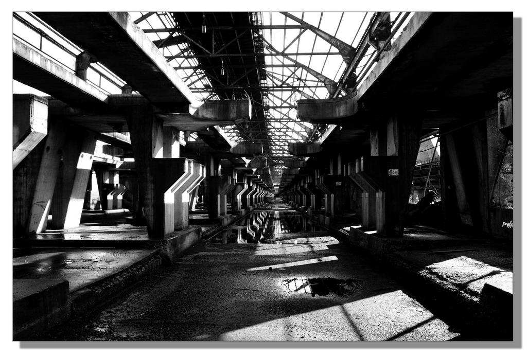 Mi colpisce l'assoluta assenza di presenze umane, come se qui solo cemento e ferro fossero i padroni del posto.. insieme al gioco del bianco della luce molto intenso e al nero delle zone in ombra molto chiuso.. bel contrasto tra le due parti...cut...