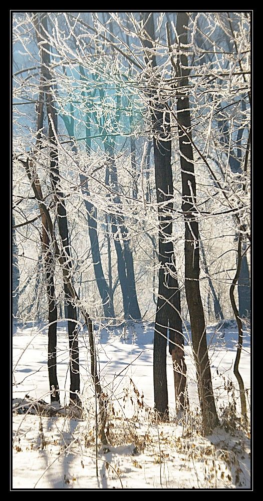 Escludendo la parte bassa vedo un bello scatto in cui il grafismo di rami e ghiaccio si fonde con i colori strani forse dovuti ad altrettanto strani effetti diffrattivi.