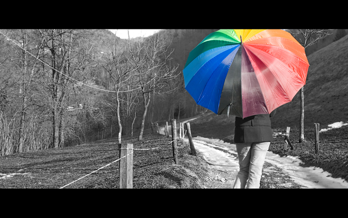 Non sono un amante delle desaturazioni parziali, ma non sono nemmeno tra quelli che pensano che sia sempre e comunque da evitare. Qui, anche se forse non racconta molto, mi sembra si integri bene a tutto il resto. Quello che non mi piace molto è la desaturazione (o perlomeno così sembra) di parte dell'ombrello e il fatto che i neri siano apertissimi... infatti in questo concordo con gli ultimi interventi.