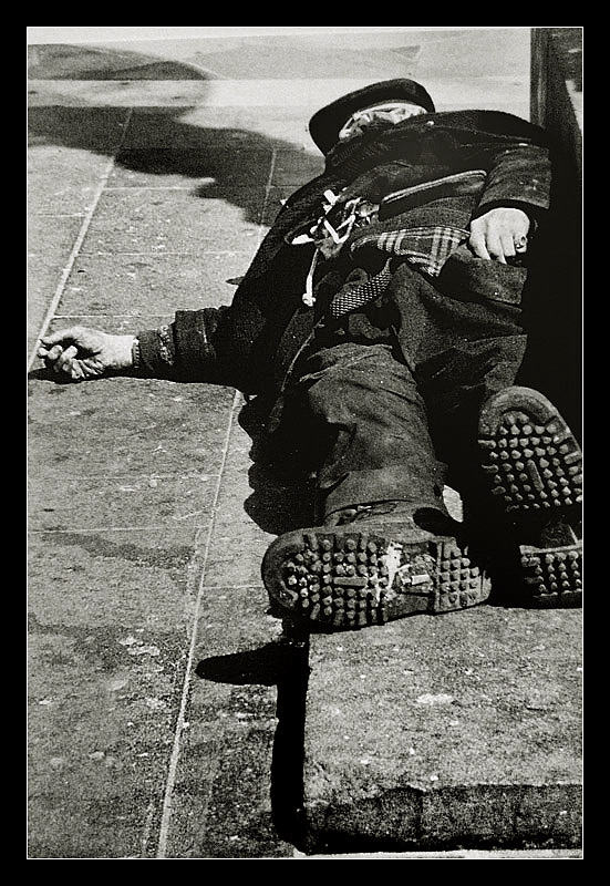 | I miei più sentiti complimenti per il bn da cronaca ed il taglio che mi ricorda alcuni quadri antichi con una prospettiva molto spinta...credo che quello a cui mi riferisco ci fosse un Cristo disteso....ma purtroppo non mi intendo di arte. Per tornare alla foto complimenti anche per la composizione: la mano a sinistra probabilmente caduta nel sonno rende perfettamente l'idea della disfatta della vita. Le suole, in primissimo piano, sono dure e sporche al pari dell'immagine nella sua interezza. Buona la scelta di comprendere lo spigolo del gradino: misero piedistallo di una di una sfortunata figura urbana. Solo due appunti: peccato davvero tu abbia tagliato la suola a dx. Avrei lasciato un po' + di spazio sulla sx, oltre ala mano. |