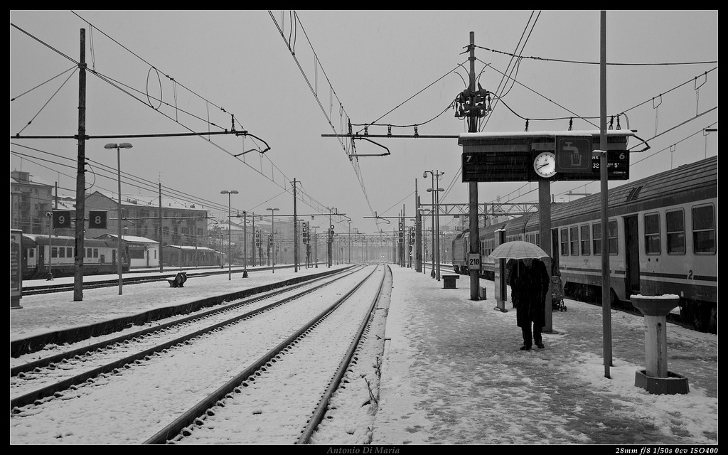 la foto mi piace, ha una bella composizione: i binari, i treni fermi ai lati, i tipici oggetti da stazione (orologio in alte, cartellone con il ritardo, la fontana), i fili in alto e le luci del treno in fondo ai binari.