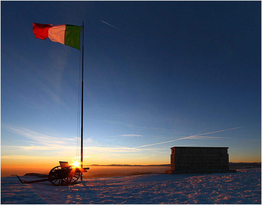 tramonto in Cima Grappa, luogo del sacrario di 23000 ragazzi a malapena ventenni che di tramonti non ne hanno visti più...per difendere anche quella bandiera(metà austriaci e metà italiani).pensiamoci a quanto valgono quei tre colori.