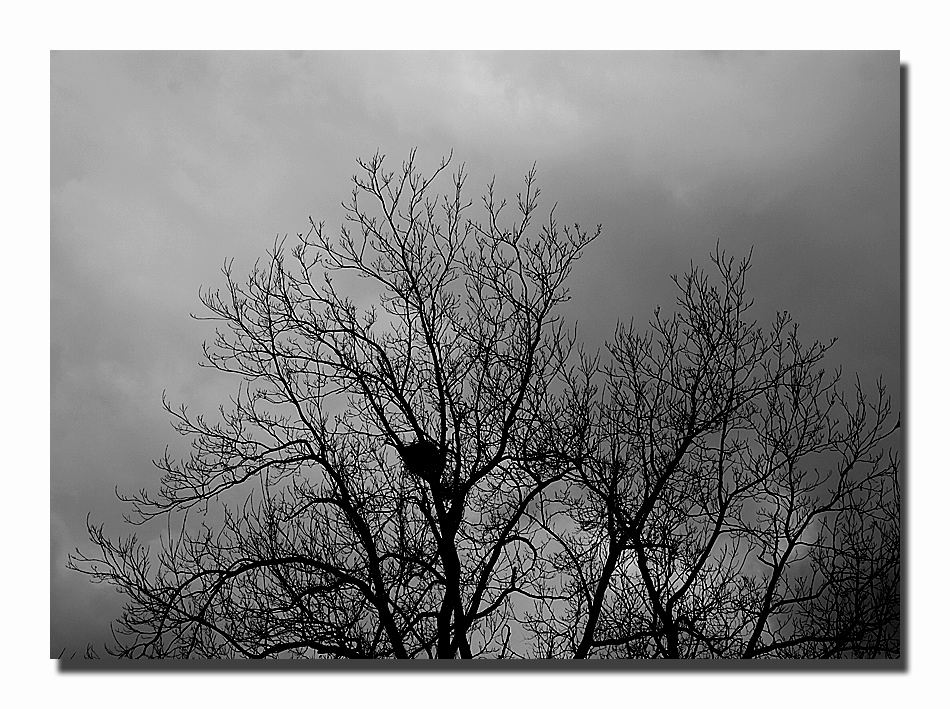 Bellissimi i rami che si tendono al cielo, quasi implorando un raggio di sole, che quel cielo scuro nega, bravissimo