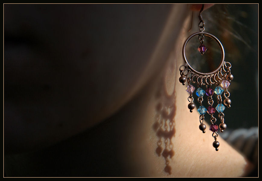 Deliziosa l'ombra del pendente che bacia delicatamente il collo. Mi sarebbe piaciuto maggiormente che il collo della ragazza terminasse dove tormina l'incarnato e che il gancio dell'orecchino fosse ripreso nella sua interezza.