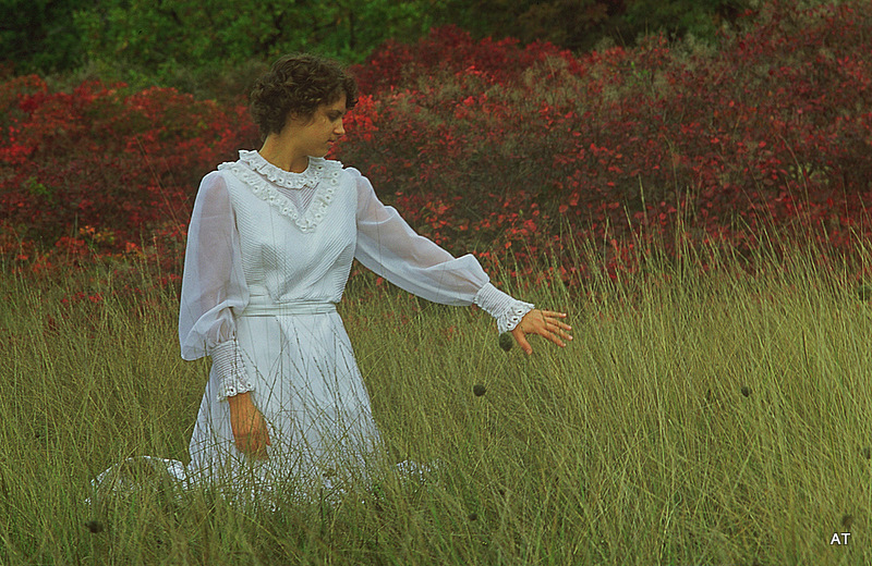 Nostalgica e pensierosa!! Bello il contrasto delle piante rosse sullo sfondo e la luce morbida/velata
