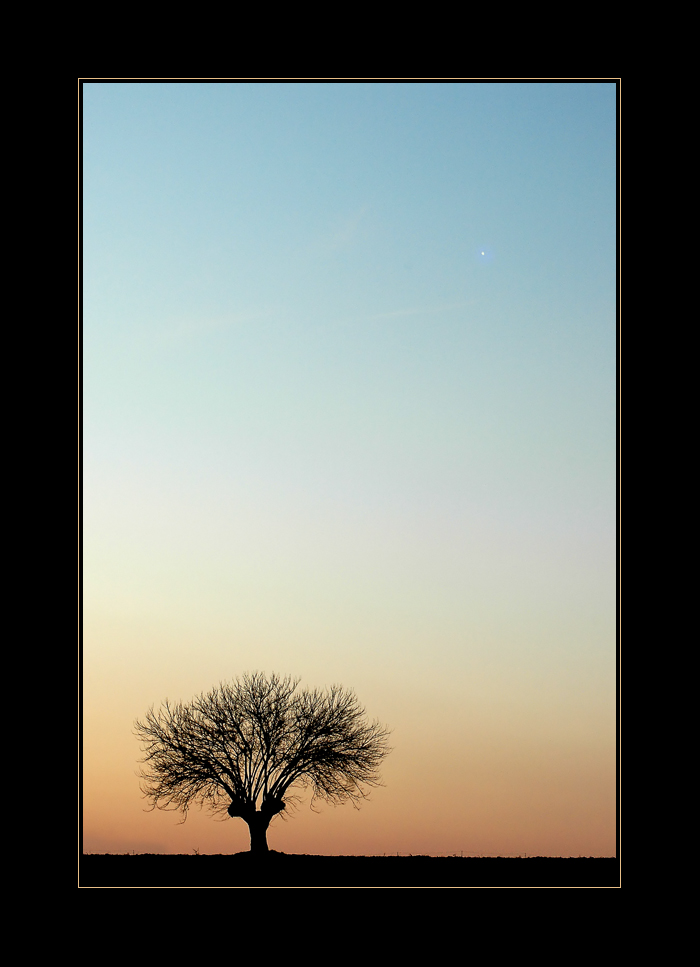 Nella sua essenzialità hai saputo cogliere un'immagine stupenda e meravigliosa. Il cielo dai toni color pastello messo come soggetto primario in tutta la sua bellezza di sfumature armoniosamente degradanti. La silhouette dell'albero e di una piccola striscia di terra non fanno che impreziosire l'immagine. Ultima chicca Venere. Compo, pdc e maf perfetti. Taglio ottimo.
