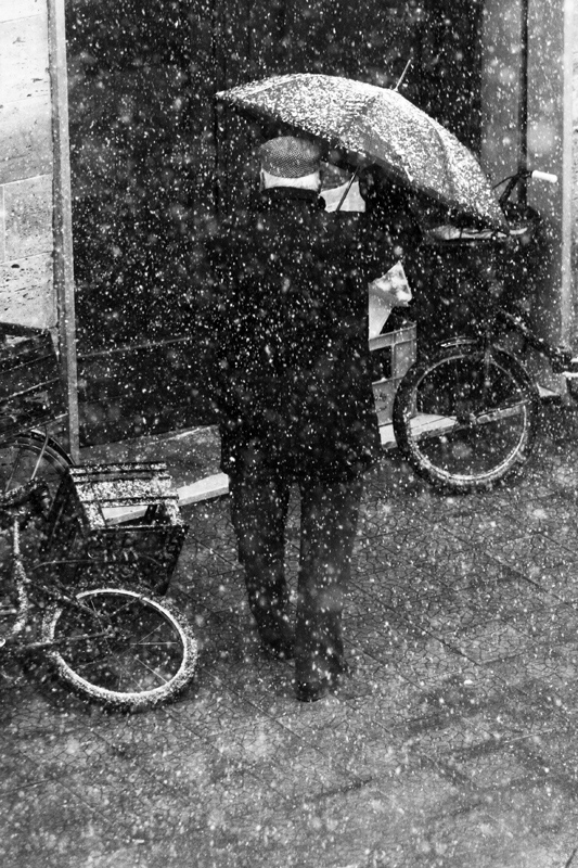 Il gesto del chiudere l'ombrello anima il fotogramma, le biciclette per me ci stanno bene, peccato la cassetta con il suo contenuto bianco dietro il soggetto che disturba un pò il profilo del braccio, ma trattandosi di un'istantanea non c'era tempo di studiare tutti i particoalari.