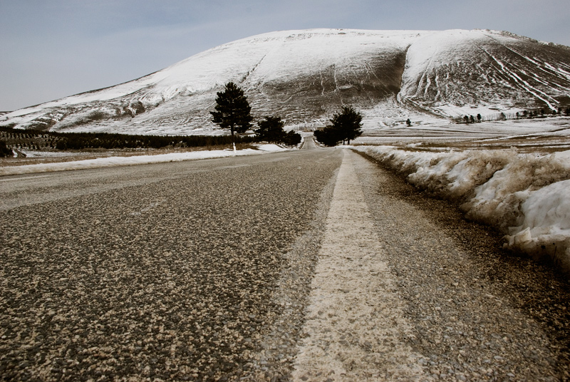 Belle queste linee diritte e curve, nonché il sale e pepe dell'asfalto che riprende quello della montagna in fondo. Bello anche l'ultimo lembo di strada che crea una specie di illusione ottica rispetto al primo tratto.