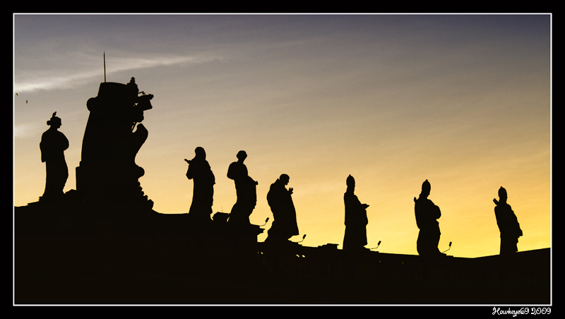 L'ottimo punto di ripresa ed il controluce trasformano le statue in una sequenza di personaggi danzanti.