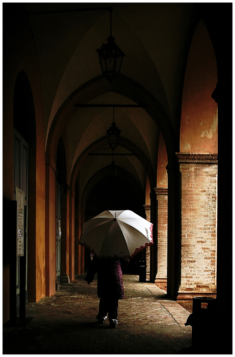 Forse,giocando un po' col comando ombre/luci di photoshop per alleggerire un po' le ombre potrebbe addirittura migliorare; in ogni caso è una foto che io trovo di grande bellezza. Curioso l'ombrello tenuto aperto sotto il portico - ma circostanza fortunata, perché componente essenziale nel gioco delle obbre e delle luci.