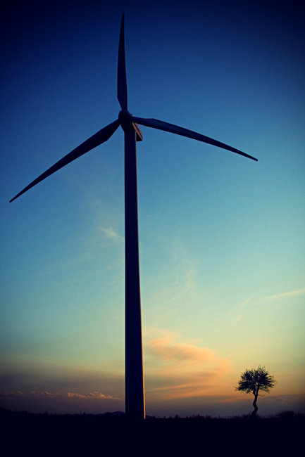 Bella composizione,azzeccato il contrasto tra la pala eolica e l'alberello