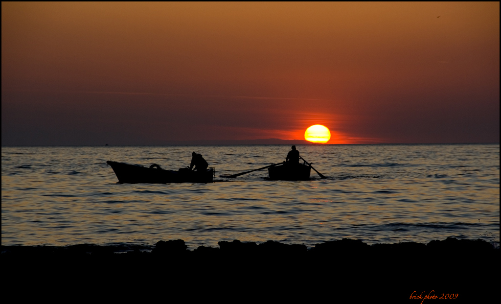Brick, x me se fai una foto con pochi elementi , parere personalissimo per carità, li sistemerei in maniera tale da occupare tutto il frame. Se ti spostavi verso dx avresti ottenuto i pescatori più decentrati rispetto al sole. Così il sole-pescatore lo considero un elemento solo, cmq troppo vicini, che non spazio a vedere ai lati, perchè sinceramente non c'è niente da vedere.