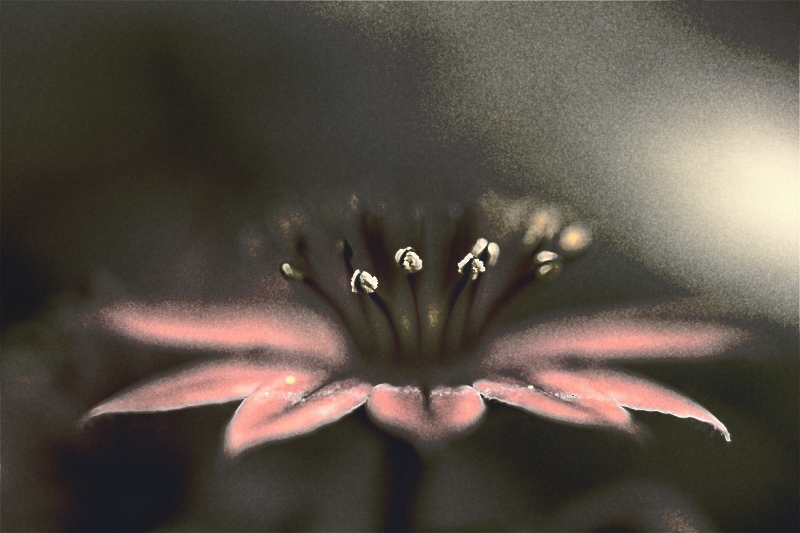 Mi trova d'accordo la diversa incisività dei pistilli del fiore, e la costante sfocatura di tutto il resto.. che rende il tutto un quadro chiuso e sofferto, spento e soffocato, nonostante la presenza di quel bianco al centro, che dovrebbe evocare la vita e la leggerezza, nella stessa idea di un fiore.. :)