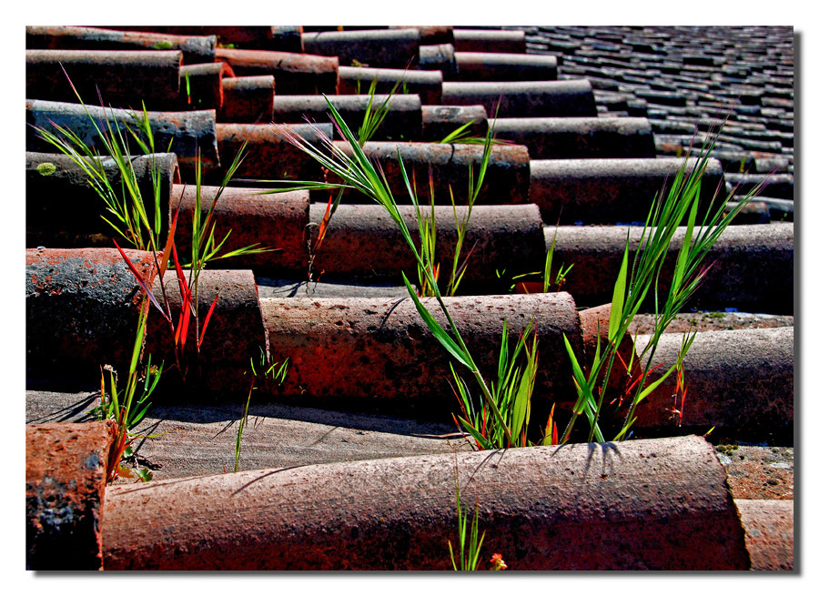 Ho scattato questa foto circa un anno fa, quando affacciandomi dalla finestra, sono rimasto colpito dal fatto che l'erba era riuscita a germogliare su quel misero strato di terra che pioggia e vento avevano accumulato fra le tegole del tetto difronte.