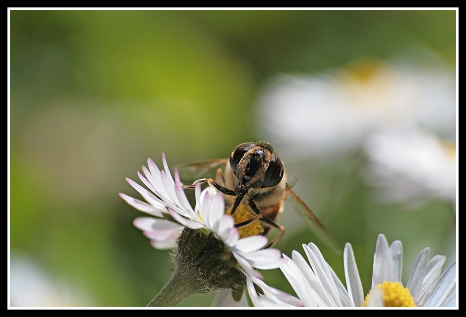 Si poteva togliere la parte di sx inquadrando in verticale. Così lasciavi i fiori sfumati a dx come sfondo ed avresti incluso la margherita in basso tagliata.
