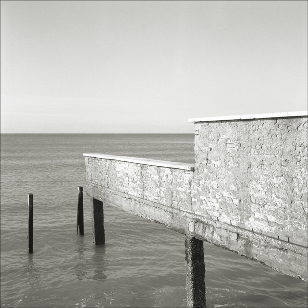 Il muro in fondo si fonde con il mare a un primo sguardo (in stampa non accadrà ovviamente, a meno che tu non lo voglia ), in questa versione web, cosa che si vede in spesso magritte (es: figure che si fondono con il cielo), inoltre la mancanza dell'ombra del muro stesso (scelta che condivido in pieno) lo rende assolutamente sospeso, come se fosse apparso dal nulla in quel preciso istante (al che credo si vada verso il metafisico).