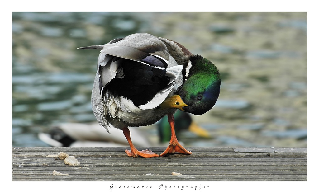Il momento di stretching che hai colto è molto interessante ed il secondo germano in sfocato anzichè disturbare sembra creare un effetto surrealista... bello il contrasto fra la posa scomposta del primo ed il placido andare del secondo