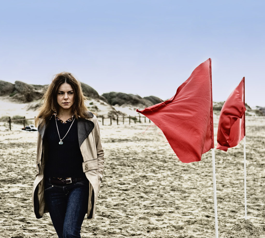 Le bandiere rosse sul set, piantate in spiaggia, sono co-protagoniste silenziose.