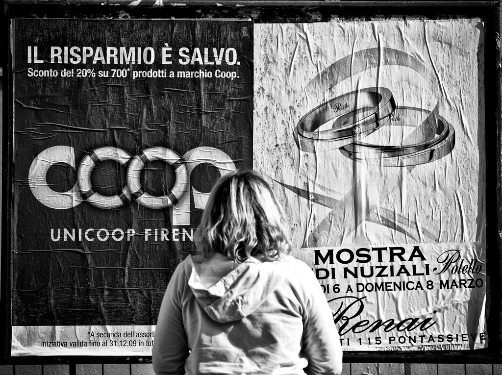 La donna al centro che fissa i due manifesti è l'immagine del proprio dissidio di fronte a due mondi opposti: nero, bianco, risparmio, lusso.