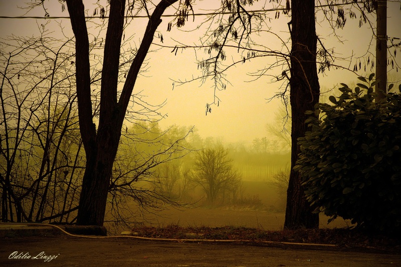 bella foto...bell'atmosfera....il giallo predominante da un senso di calore e tocca chi vede, in netto contrasto con gli alberi scuri e spogli che danno tristezza....i fili vari se sono fatti apparire apposta, bhe stanno bene....non disturbano chi legge la foto Ok!