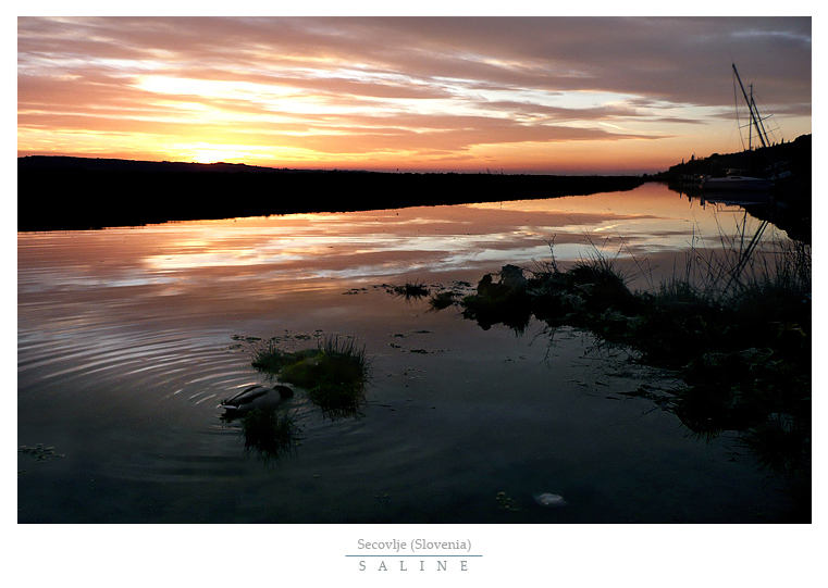 La luce del sole è forte, bruciante oltre l'orizzonte, ma resa distante dalla quiete dell'acqua liscia che si allarga appena in cerchi attorno all'anatra, quasi immobile nel suo mondo in penombra.