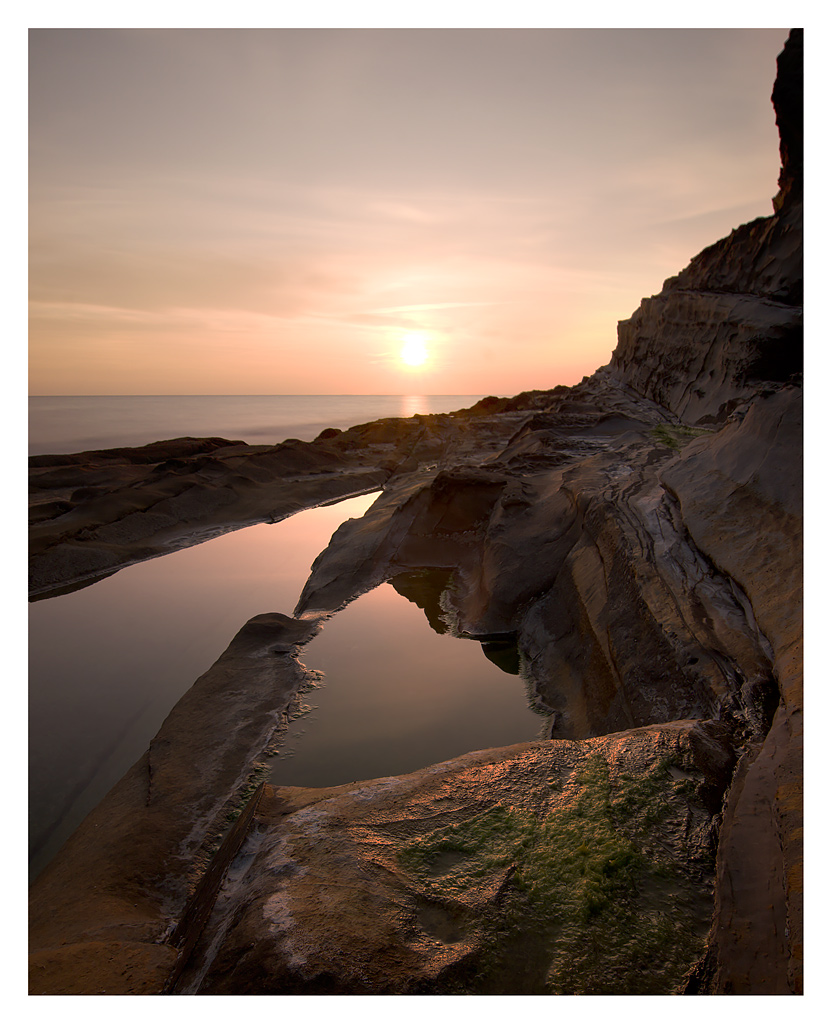 le tonalità cromatiche con tutte le varianti del rosa aumentano la sensazione di pace data dall'immobilità dell'acqua delle pozze e dalla setosità del mare. la linea d'acqua sulla sinistra e le striature della roccia sulla dx guidano lo sguardo verso l'orizzonte. peccato non poterla vedere sul monitor in tutta la sua interezza ma "solo" su è giù con il mouse. splendida però!
