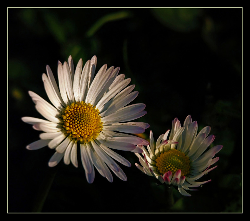 Bella la luce colta su queste margherite. Lo sfondo così scuro a me personalmente piace sempre. Quoto Pigi per un po' più di pdc che avrebbe dato maggiore definizione ai particolari dei fiori su tutta la loro superficie.