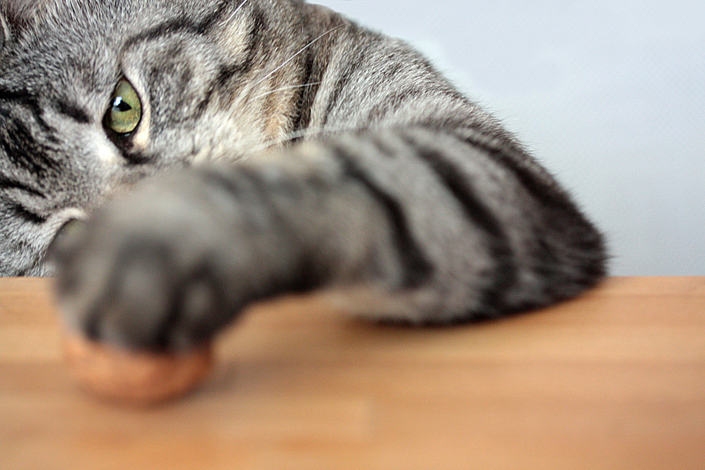 Allego un altro scatto, in cui il gatto è perplesso sul da farsi dopo aver, appunto, scaraventato la noce a terra.