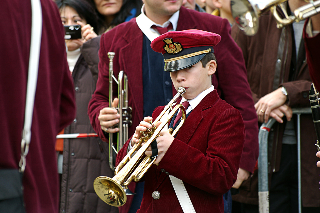 Peccato per l'inquadratura orizzontale, inquadrando in verticale avresti eliminato buona parte degli elementi di disturbo e valorizzato meglio il piccolo trombettista.