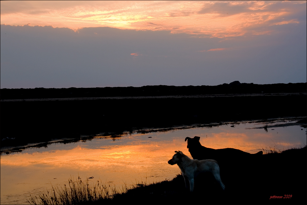 molto bello il colore del cielo che si riflette sul fiumiciattolo...buona la compo,belle le siluette dei cani...ciao  |