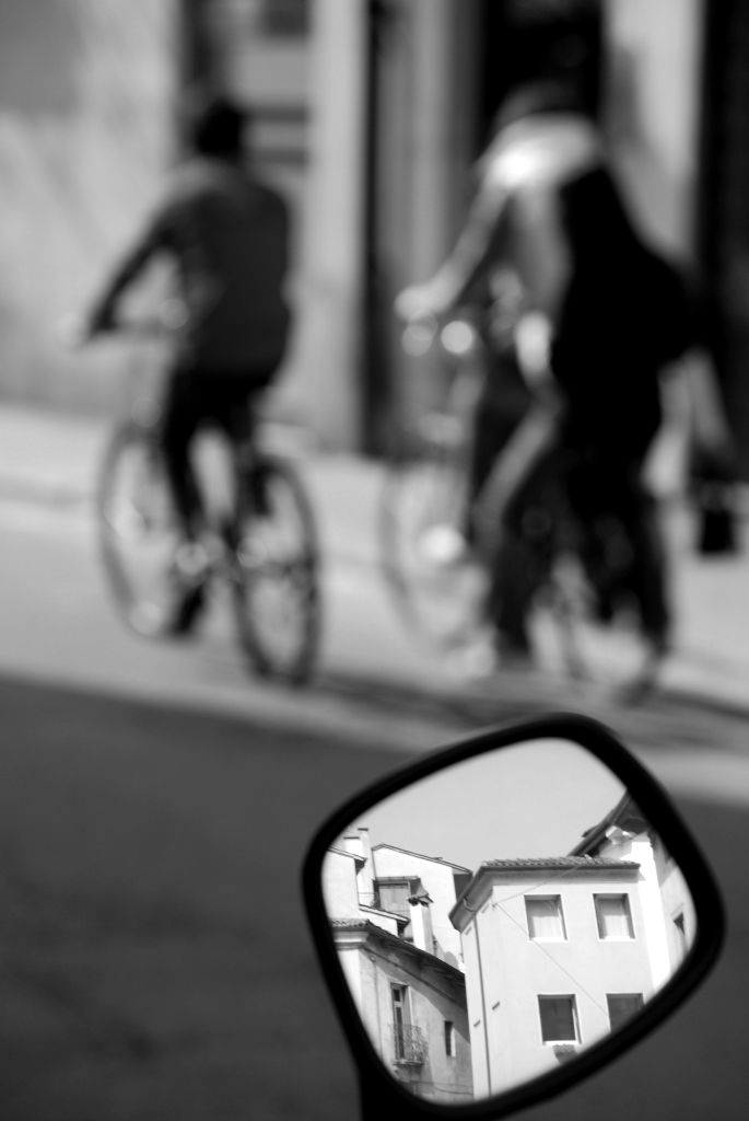 quelle case guardano quella strada e quelle biciclette..e quelle biciclette passano tra le case del centro...e lo specchietto è della mia moto parcheggiata lì ogni giorno per andare al lavoro...evidentemente non ho trasmesso questi nessi che sentivo solo io..