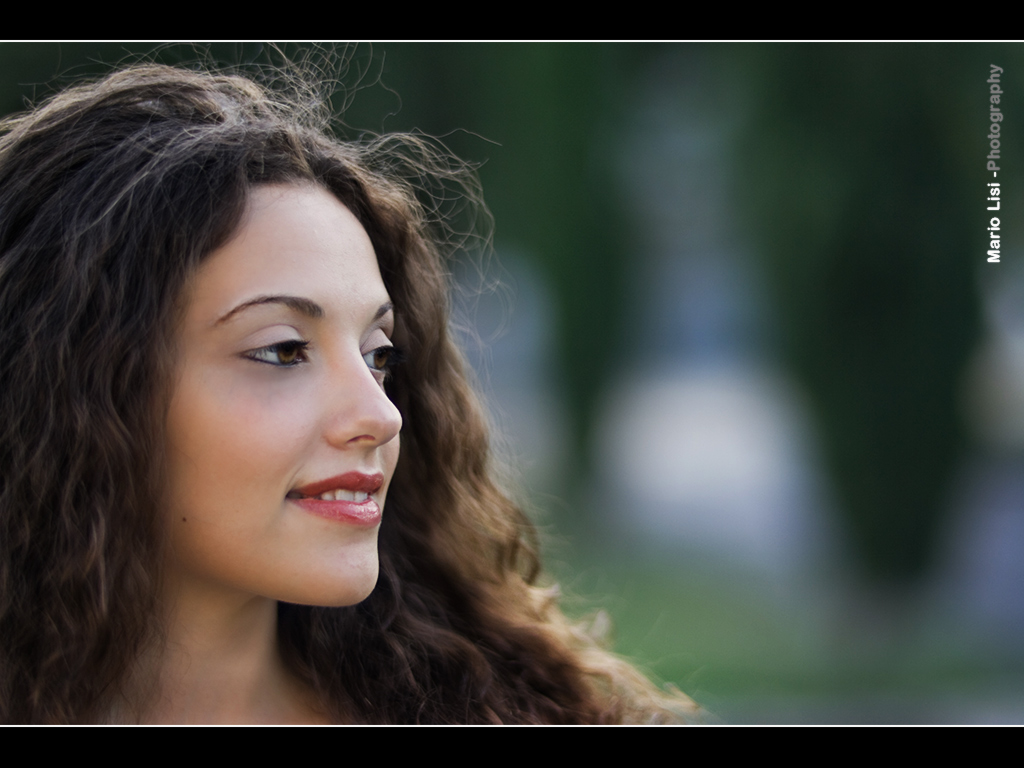 mi piace molto la composizione con molta aria davanti alla modela...a me particolarmente porta a guardare la modella, bellissima, ed a spostare poi lo sguardo verso destra x capire a chi/cosa sta sorridendo...