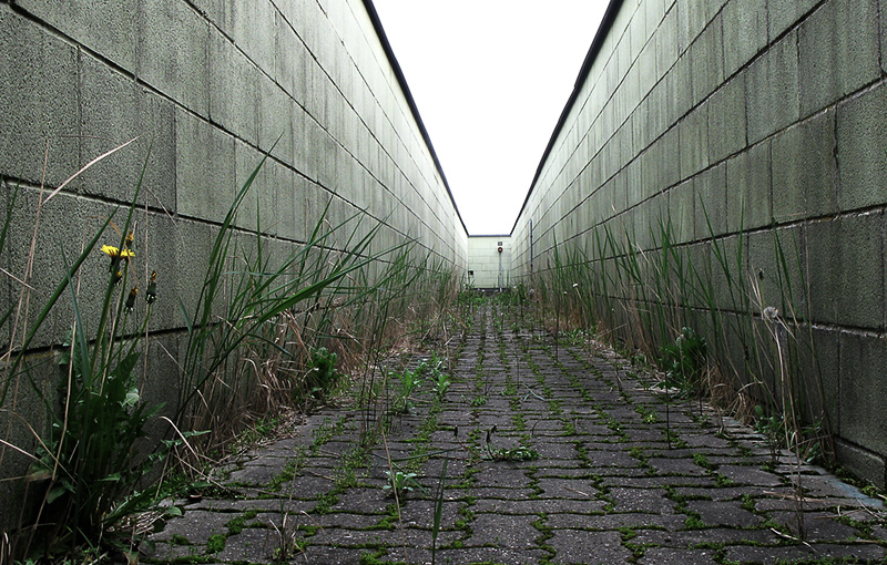 Eh si, la natura si riappropria di quel che può appena l'uomo molla la presa. Un angolo un po' trascurato e subito cresce l'erba ... che tutto sommato alla fine ingentilisce il claustrofobico vuoto del luogo.