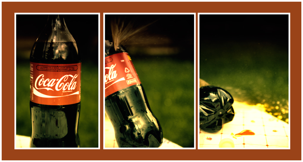 l'idea non è male, però trovo un po' di cose che non vanno: avrei usato la stessa inquadratura per tutte le foto e mantenuto più largo, visto il viraggio vintage avrei cercato di procurarmi la bottiglia di coca cola in vetro, la luce poteva essere controllata meglio, la cornice o riprendeva perfettamente il rosso del logo o era meglio muoversi su colori come bianco o nero...