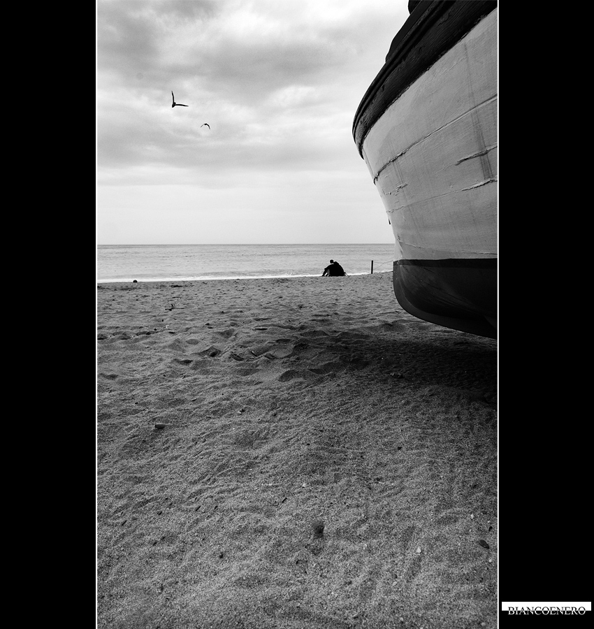 Molto gradevole, un istante classico ma ben colto con un bianco e nero tutto sommato convincente (forse ci sono margini di lavoro sul cielo, che nella parte centrale in alto non riesce a raggiungere quella quasi-sovraesposizione armonica che permetterebbe un contrasto più delicato e corposo col resto del cielo stesso). La parte in basso, diciamo approssimativamente il primo quarto della foto, insieme sottolinea la vastità del terreno, riduce la portata espressiva della barca (la cui ombra non occupa tutto ciò che è visibile all'occhio, come si sarebbe avuto con un taglio diverso) e - mi verrebbe da dire - attrae e distrae, facendo il paio con quella parte alta del cielo per nitidezza, diciamo per concretezza. E' una zona con messa a fuoco e contrasti non esattamente al livello della parte centrale (e più espressiva, quella che a mio avviso è il "soggetto" dello scatto), e che per questo attira l'attenzione forse ripagandola non completamente.