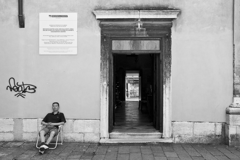 Continua la tua serie: sempre caratterizzata da una composizione di riferimento, equilibrata e precisa, curata ai margini nei minimi dettagli. Il soggetto umano partecipa al quadro in maniera armoniosa senza prendere il sopravvento ma amalgamandosi in quel momento di tranquillità e di perdita di tensione. In evidenza anche la cura dei toni di questo bianco e nero e la splendida gestione dell'esposizione in tutta la profondità del fotogramma.