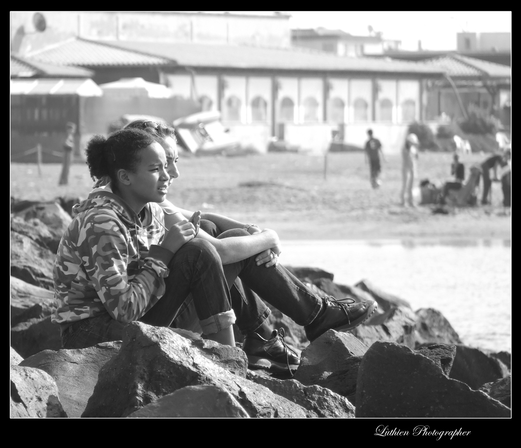 la foto è nata così non ho fatto nessun taglio.. con una compatta non posso fare miracoli... i due soggetti in questione stavano semplicemente guardando il mare e pensavo che stando sedute sullo scoglio si intuisse... non volevo narrare niente con questa foto solo immortalare i loro volti verso il mare..