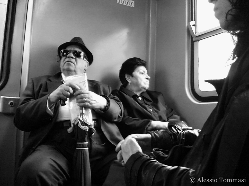 Entrato nel vagone ho notato questo signore, mi ha colpito subito. Fuori diluviava, il cielo era plumbeo, eppure teneva gli occhiali da sole. Ho preso il cellulare e ho scattato.